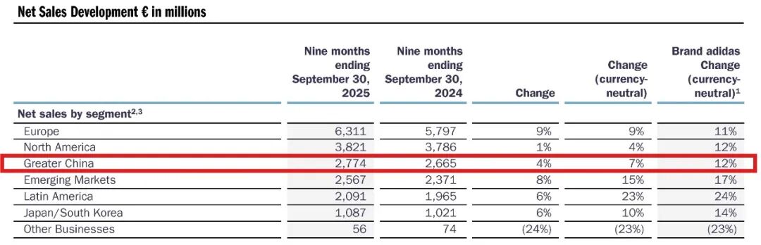 纵向比较,阿迪达斯的表现也还未恢复到早年水平。2025年大中华区前9个月收入为27.74亿欧元,同比增长了4%(货币中性基础上7%)。而2020年和2021年全年,阿迪达斯大中华区销售额都在40亿欧元以上。